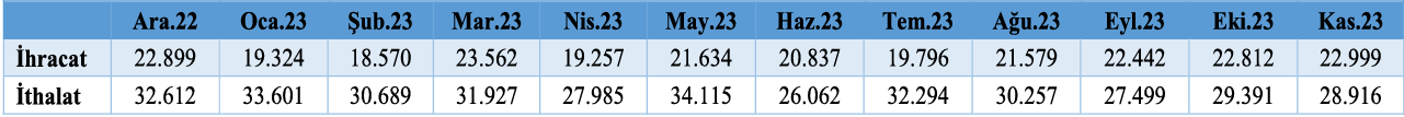 - 2023 yılı Ocak-Kasım dönemi ihracat değeri ise bir önceki yılın aynı dönemine göre yüzde 0,7 artarak 232,8 milyar dolar, ithalat değeri ise yüzde 0,5 artarak 332,7 milyar dolar seviyesinde gözlenmiştir.