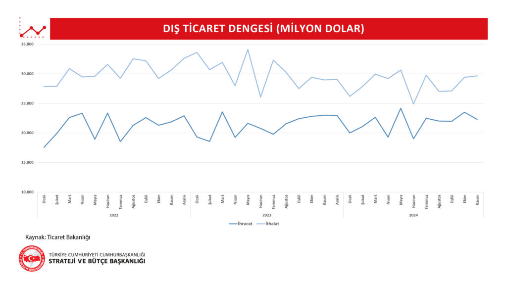 • 2024 yılının Kasım ayında dış ticaret açığı bir önceki yılın aynı ayına göre yüzde 23,3 oranında artarak 7,4 milyar dolar seviyesinde kaydedilmiştir.