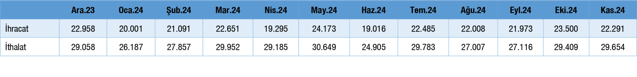 • Ticaret Bakanlığının açıkladığı geçici verilere göre 2024 yılının Kasım ayında ihracat bir önceki yılın aynı ayına göre yüzde 3,1 oranında azalarak 22,3 milyar dolar, ithalat ise yüzde 2,4 oranında artarak 29,7 milyar dolar seviyesinde kaydedilmiştir.