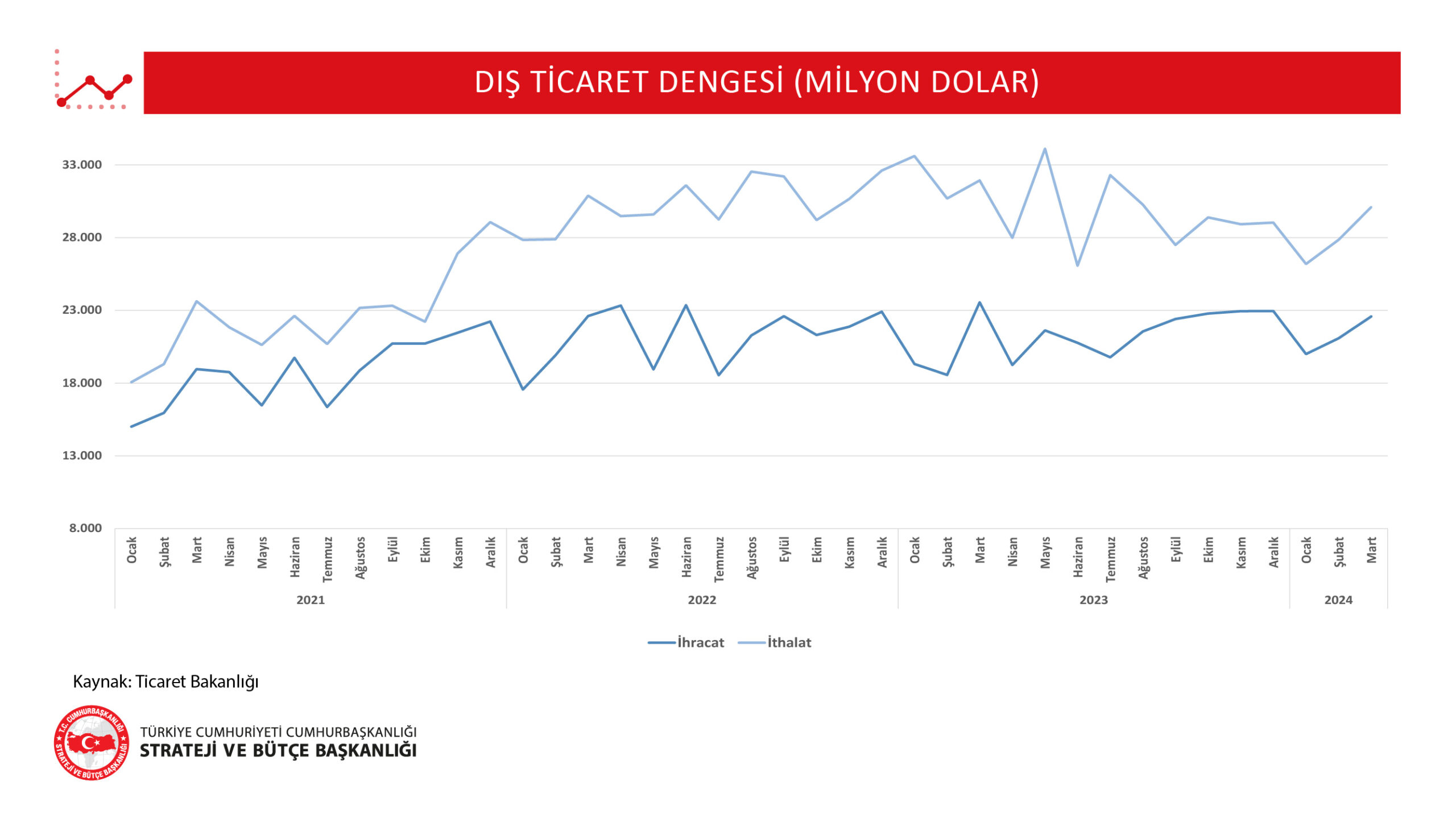 - 2024 yılı Mart ayı yıllıklandırılmış dış ticaret açığı ise bir önceki yılın aynı dönemine göre yüzde 21,9 oranında azalarak 92 milyar dolar seviyesinde gözlenmiştir.