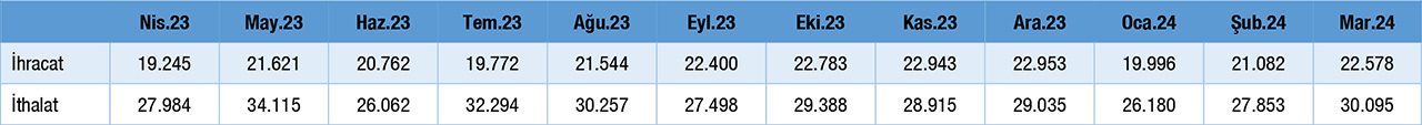 - 2024 yılı Mart ayı yıllıklandırılmış ihracat değeri ise yüzde 0,8 oranında artarak 257,7 milyar dolar, ithalat değeri ise yüzde 6,3 oranında azalarak 349,7 milyar dolar seviyesinde gözlenmiştir.