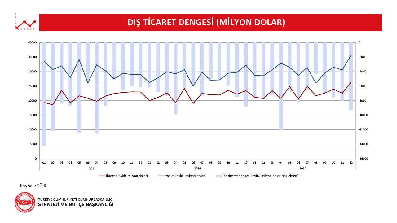 • Türkiye İstatistik Kurumu tarafından açıklanan verilere göre, 2025 yılı Aralık ayında ihracat bir önceki yılın aynı ayına göre yüzde 12,7 oranında artarak 26 milyar 373 milyon dolar, ithalat ise yüzde 10,7 oranında artarak 35 milyar 674 milyon dolar seviyesinde gerçekleşmiştir.