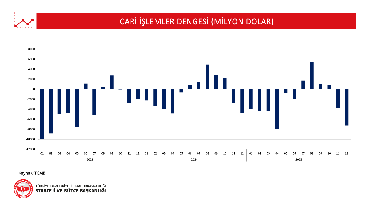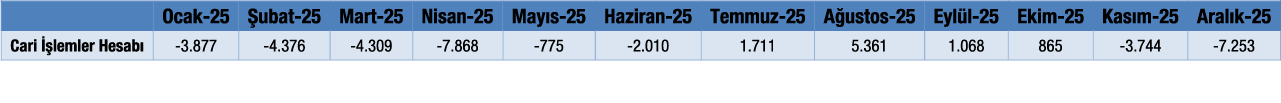 • 2025 yılı Aralık ayında cari işlemler dengesi 7.253 milyon dolar açık vermiştir.