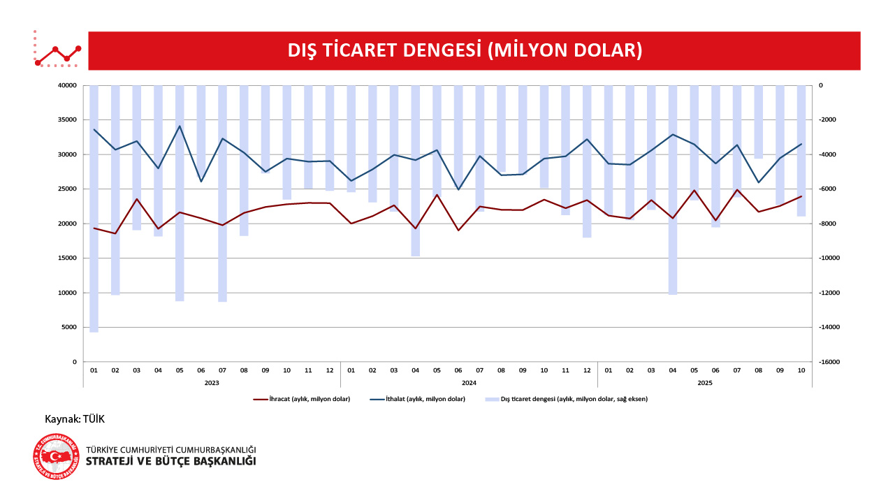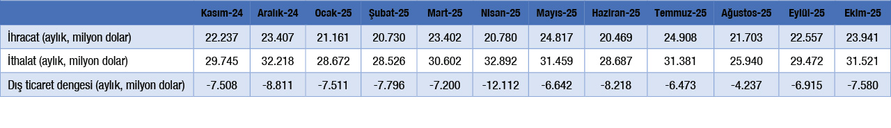 • Türkiye İstatistik Kurumu tarafından açıklanan verilere göre, 2025 yılı Ekim ayında ihracat bir önceki yılın aynı ayına göre yüzde 2 oranında artarak 23 milyar 941 milyon dolar, ithalat ise yüzde 7,2 oranında artarak 31 milyar 521 milyon dolar seviyesinde gerçekleşmiştir.