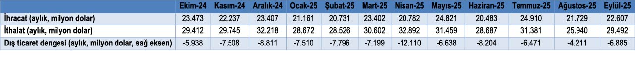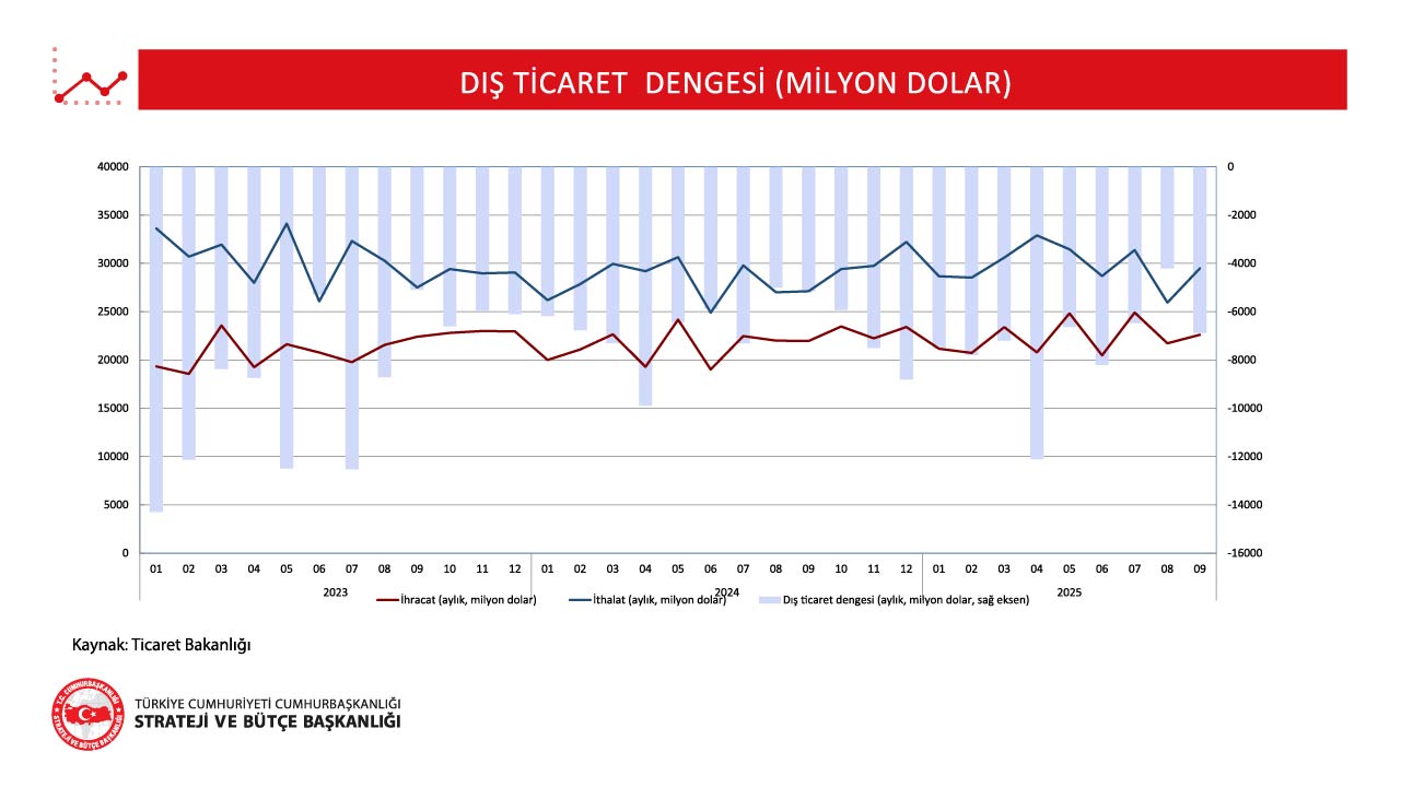 • Ticaret Bakanlığının açıkladığı geçici verilere göre 2025 yılı Eylül ayında ihracat bir önceki yılın aynı ayına göre yüzde 3 oranında artarak 22,6 milyar dolar, ithalat yüzde 8,8 oranında artarak 29,5 milyar dolar seviyesinde kaydedilmiştir.