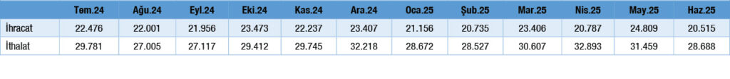 - Türkiye İstatistik Kurumu tarafından açıklanan verilere göre, 2025 yılının Haziran ayında ihracat bir önceki yılın aynı ayına göre yüzde 7,9 oranında artarak 20 milyar 515 milyon dolar, ithalat ise yüzde 15,2 oranında artarak 28 milyar 688 milyon dolar seviyesinde gerçekleşmiştir.