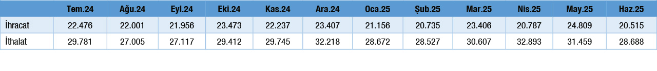 - 2025 yılı Haziran ayında yıllıklandırılmış ihracat bir önceki yıla göre yüzde 3,2 oranında artarak 267 milyar dolar, ithalat ise yüzde 2,9 oranında artarak 356 milyar dolar olarak gerçekleşmiştir.