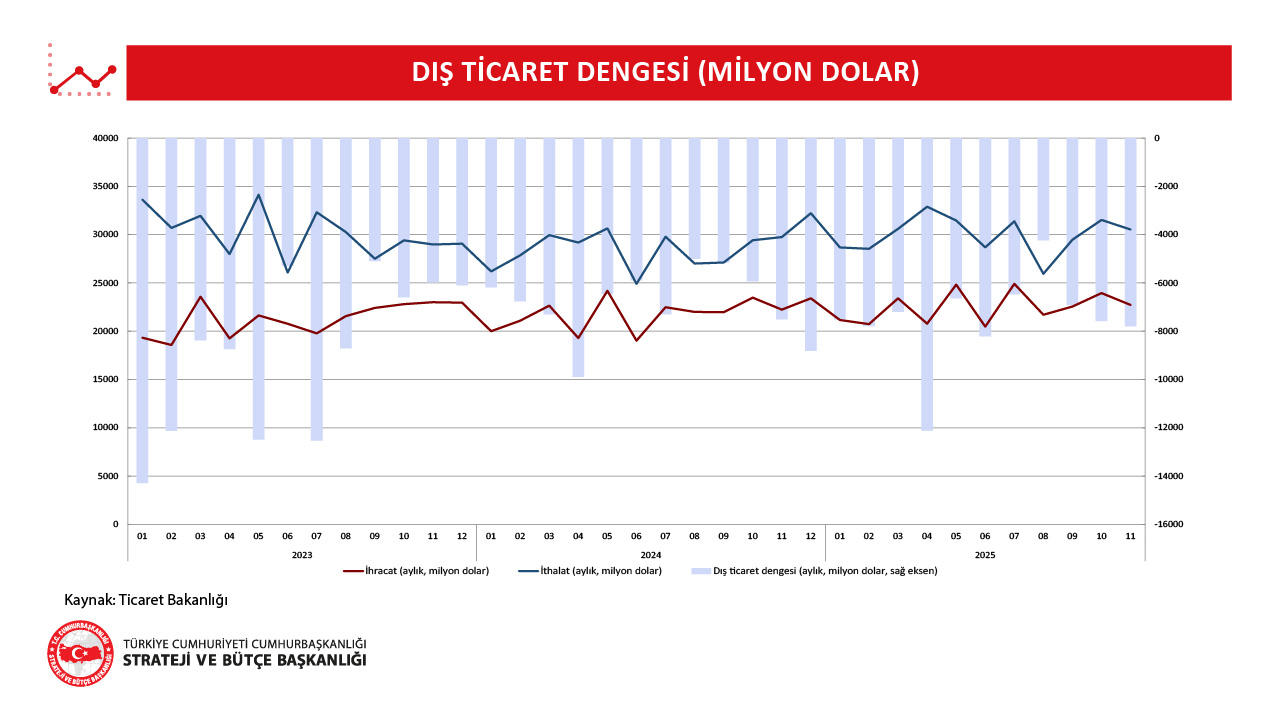 - Ticaret Bakanlığının açıkladığı geçici verilere göre 2025 yılı Kasım ayında ihracat bir önceki yılın aynı ayına göre yüzde 2,2 oranında artarak 22 milyar 718 milyon dolar, ithalat yüzde 2,6 oranında artarak 30 milyar 523 milyon dolar seviyesinde kaydedilmiştir.