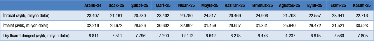 - 2025 yılı Kasım ayı yıllıklandırılmış ihracat değeri ise bir önceki yıla göre yüzde 3,6 oranında artarak 270,6 milyar dolar, ithalat değeri ise yüzde 6,2 oranında artarak 361,9 milyar dolar seviyesinde gözlenmiştir.