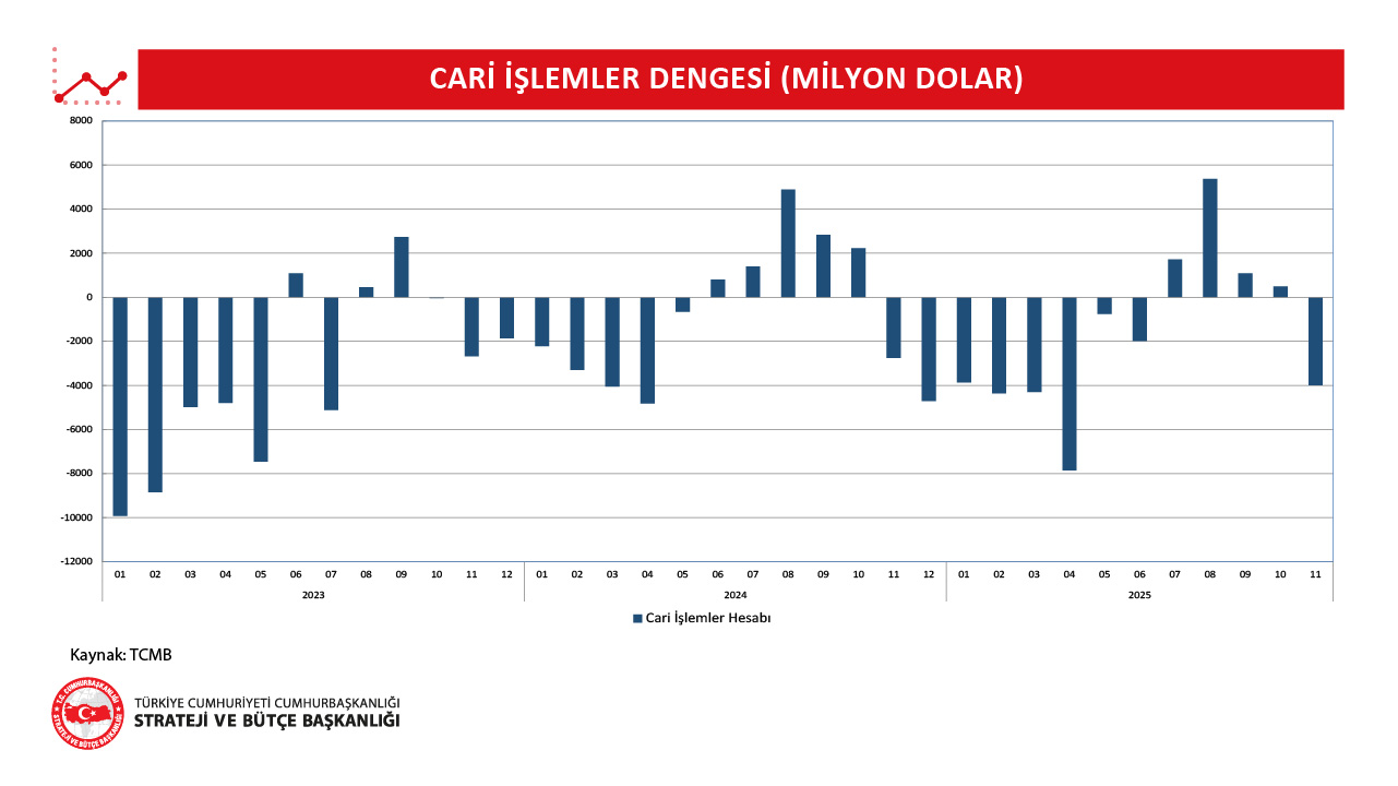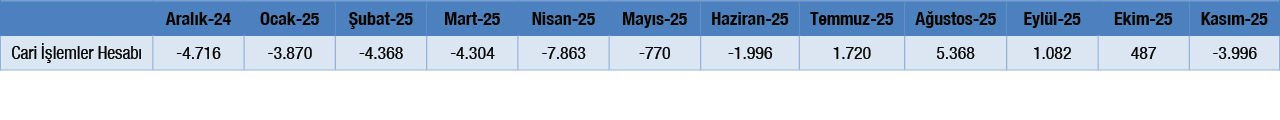 - 2025 yılı Kasım ayında cari işlemler dengesi 3.996 milyon dolar açık vermiştir.