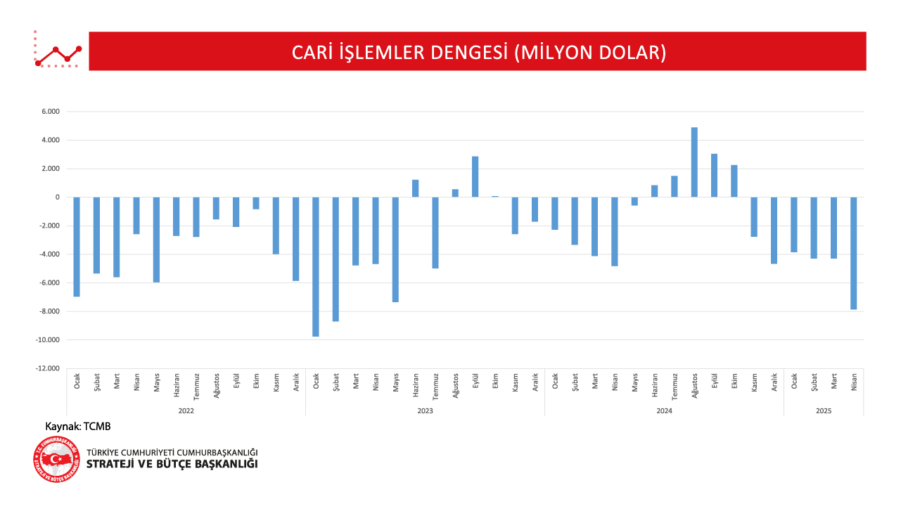 • 2025 yılı Nisan ayı itibarıyla yıllıklandırılmış cari işlemler açığı ise 15,8 milyar dolar seviyesinde gerçekleşmiştir.