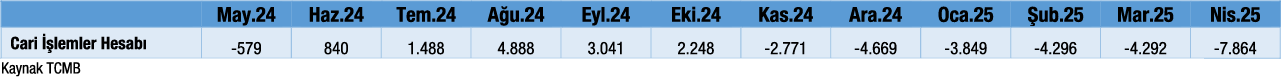 • 2025 yılı Nisan ayında cari işlemler dengesi 7.864 milyon dolar açık vermiştir.