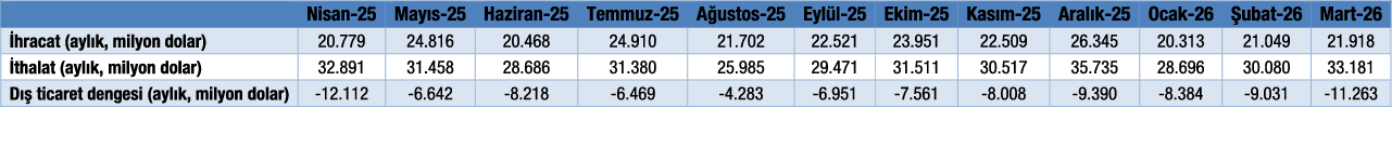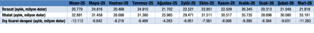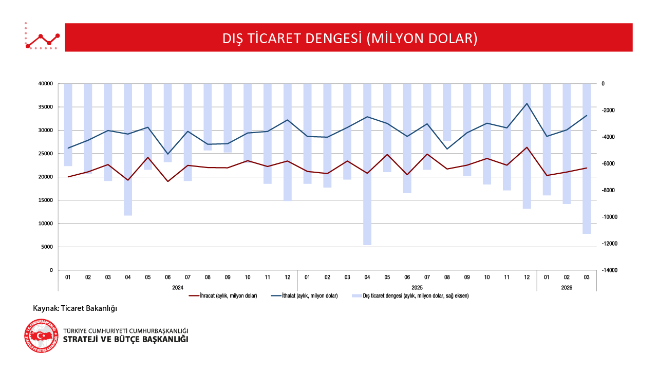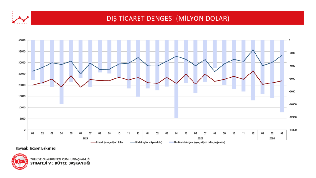 - 2026 yılı Mart ayında dış ticaret açığı bir önceki yılın aynı ayına göre yüzde 56,6 oranında artarak 11,3 milyar dolar seviyesinde kaydedilmiştir. 2026 yılı Mart ayı yıllıklandırılmış dış ticaret açığı ise bir önceki yılın aynı dönemine göre yüzde 16,4 oranında artarak 98,3 milyar dolar seviyesinde kaydedilmiştir. 2026 yılı Ocak-Mart dönemi dış ticaret açığı bir önceki yılın aynı dönemine göre yüzde 27,5 oranında artarak 28,7 milyar dolar seviyesinde gerçekleşmiştir.