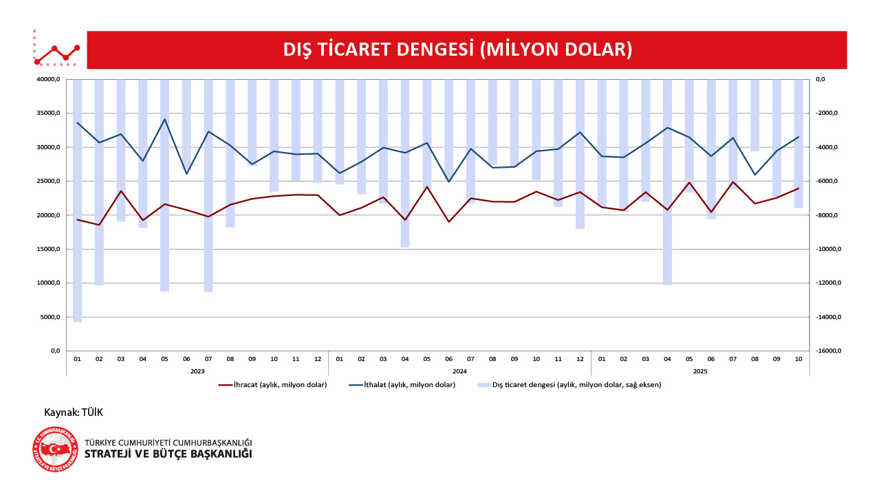- Türkiye İstatistik Kurumu tarafından açıklanan verilere göre, 2025 yılı Ekim ayında ihracat bir önceki yılın aynı ayına göre yüzde 2,0 oranında artarak 23 milyar 941 milyon dolar, ithalat ise yüzde 7,2 oranında artarak 31 milyar 521 milyon dolar seviyesinde gerçekleşmiştir.
