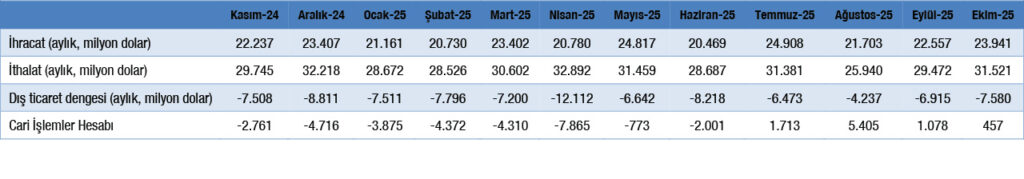 - Türkiye İstatistik Kurumu tarafından açıklanan verilere göre, 2025 yılı Ekim ayında ihracat bir önceki yılın aynı ayına göre yüzde 2,0 oranında artarak 23 milyar 941 milyon dolar, ithalat ise yüzde 7,2 oranında artarak 31 milyar 521 milyon dolar seviyesinde gerçekleşmiştir.