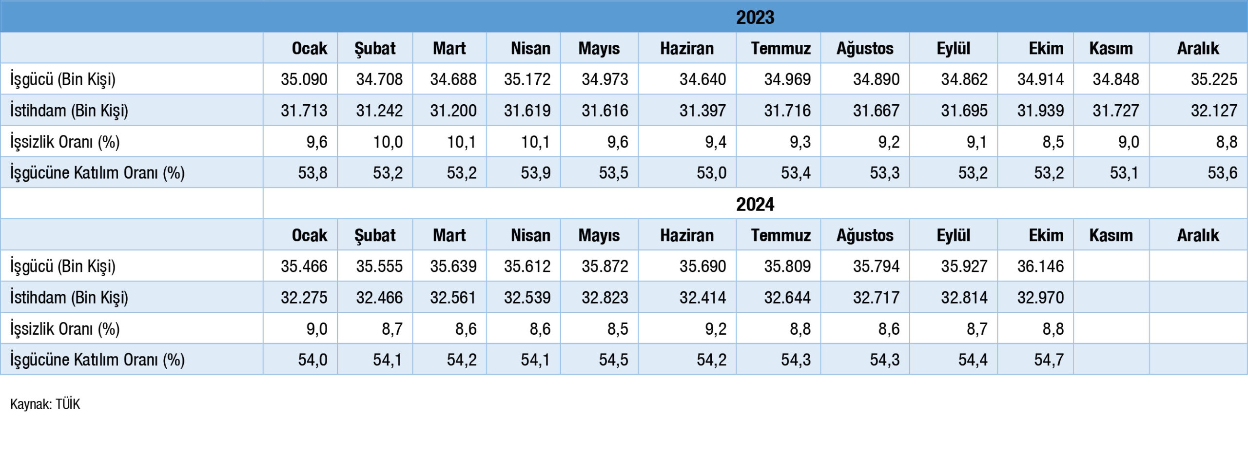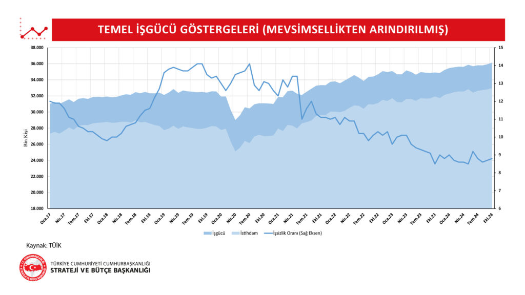 - 10 Aralık 2024 tarihinde açıklanan işgücü istatistiklerine göre işsizlik oranı 2024 yılı Ekim ayında yüzde 8,8 seviyesinde gerçekleşti.