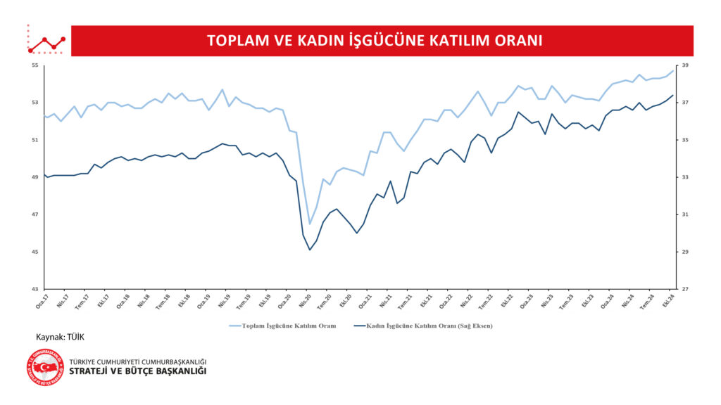 - İşgücü 35 milyon 994 bin kişi, işgücüne katılım oranı ise yüzde 54,5 olarak gerçekleşti.