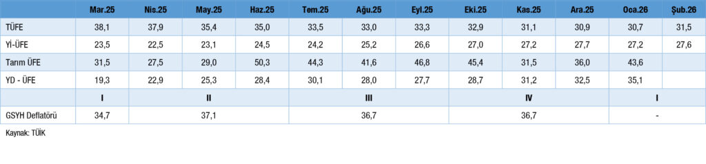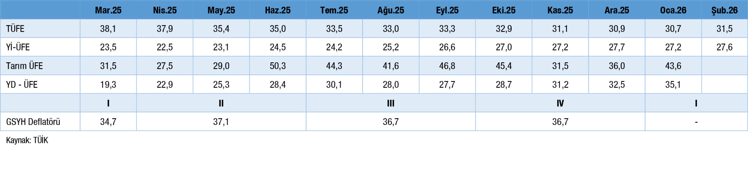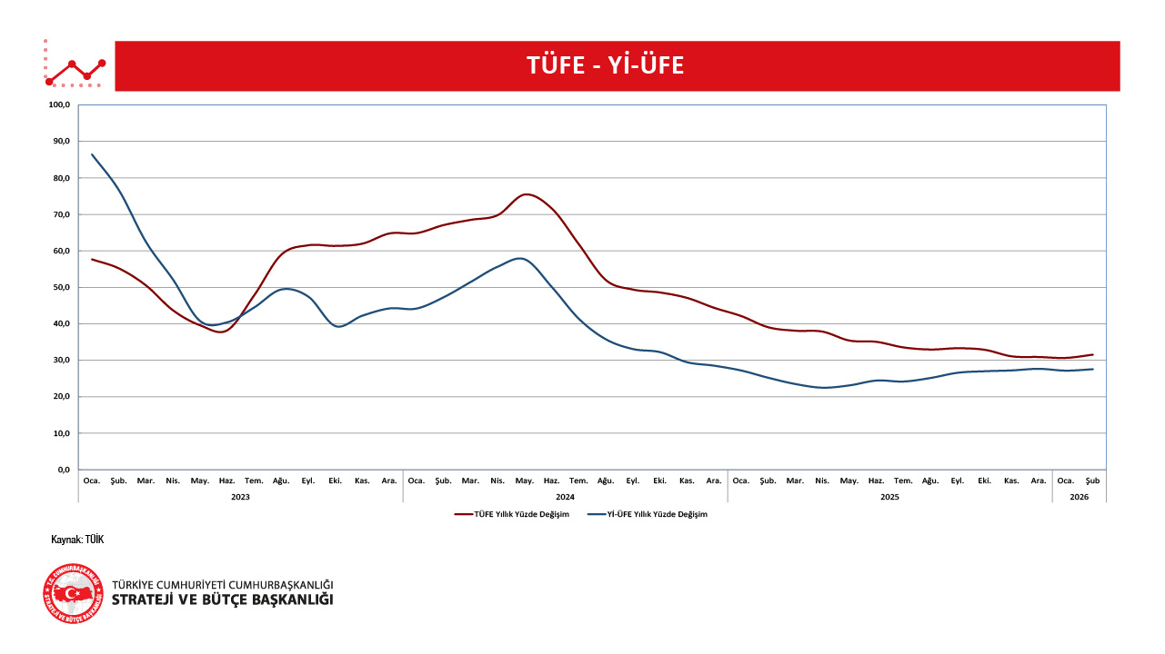 - 2026 yılı Şubat ayında TÜFE yüzde 2,96 oranında artmıştır. Şubat ayındaki gelişmeyle birlikte yıllık enflasyon bir önceki aya kıyasla 0,88 puan artarak yüzde 31,53 düzeyinde gerçekleşmiştir.