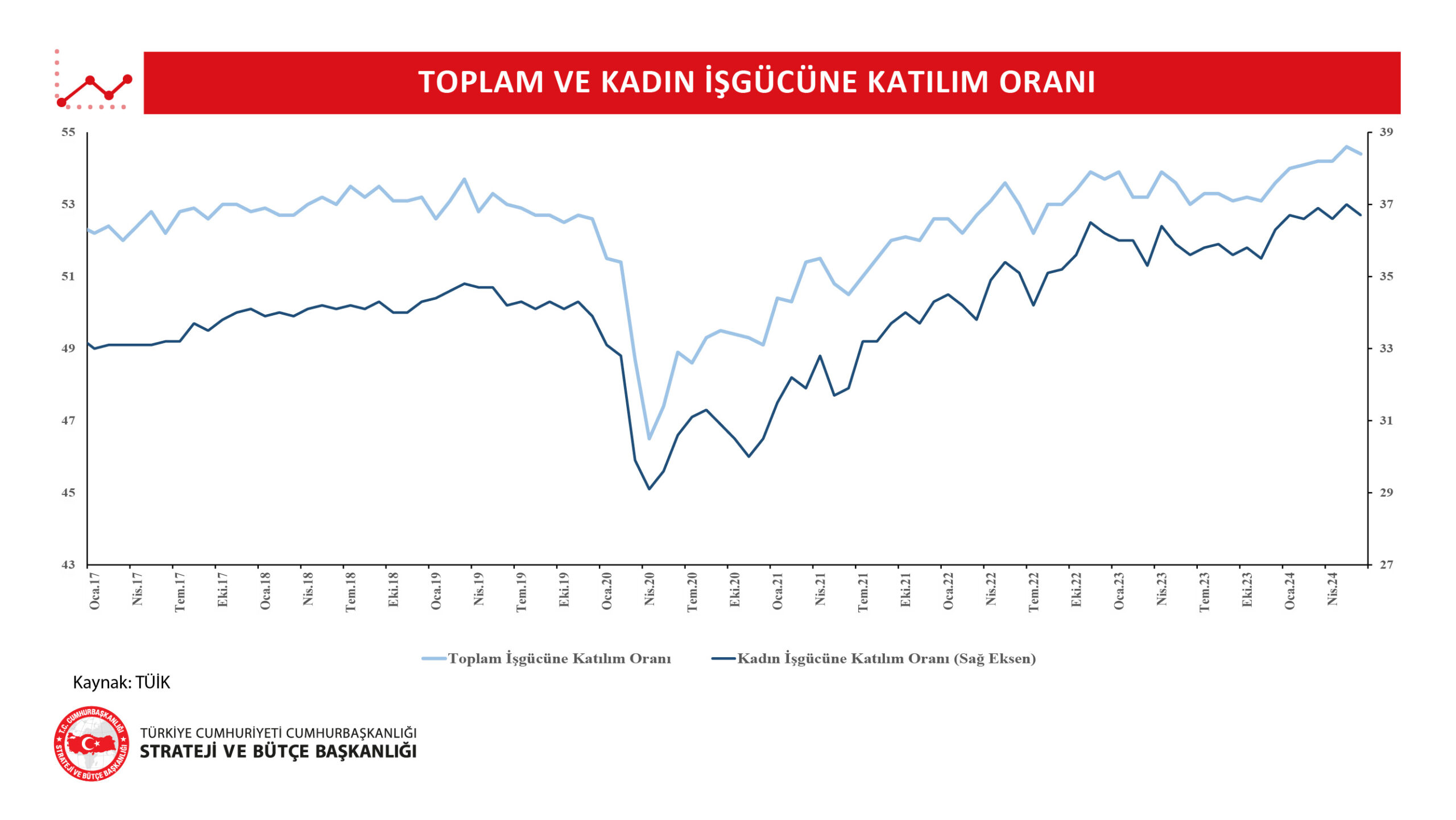 • İşgücü 35 milyon 827 bin kişi, işgücüne katılım oranı ise yüzde 54,4 olarak gerçekleşti.