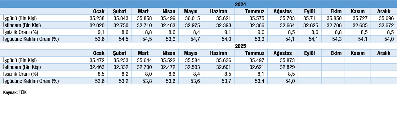 - 30 Eylül 2025 tarihinde açıklanan işgücü istatistiklerine göre işsizlik oranı 2025 yılı Ağustos ayında yüzde 8,5 seviyesinde gerçekleşti.