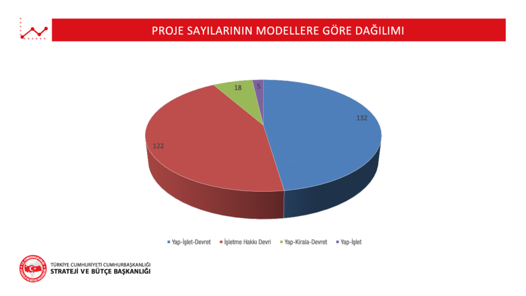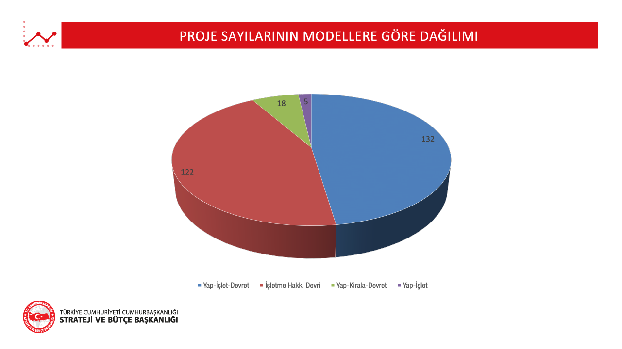 • Ülkemizde gerçekleştirilen KÖİ projelerinde 4 farklı KÖİ modeli kullanılmaktadır. Bu modeller arasından en çok kullanılanı 132 projeyle Yap-İşlet-Devret iken, onu 122 projeyle İşletme Hakkı Devri, 18 projeyle Yap-Kirala-Devret ve 5 projeyle Yap-İşlet modelleri takip etmektedir.