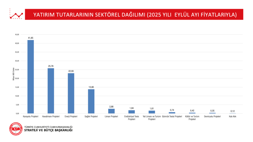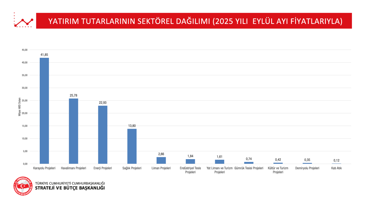 • KÖİ modeliyle gerçekleştirilen projelerin 2025 yılı Eylül ayı fiyatlarıyla yatırım tutarlarının[1] sektörel dağılımına bakıldığında; 41,85 Milyar ABD Doları ile karayolu sektörünün ilk sırada olduğu görülmektedir. Havaalanları ise 25,78 Milyar ABD Doları ile ikinci sıradadır. Bunu 22,93 Milyar ABD Doları ile enerji sektörü takip etmektedir. Yap-Kirala-Devret modeliyle gerçekleştirilen sağlık projeleri 13,80 Milyar ABD Doları ile dördüncü sıradadır.