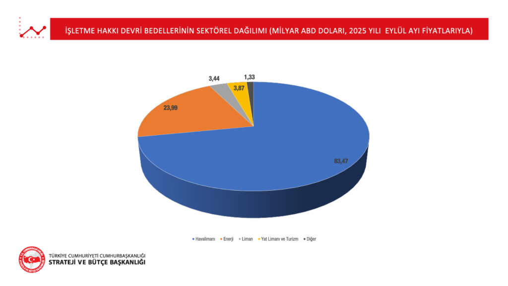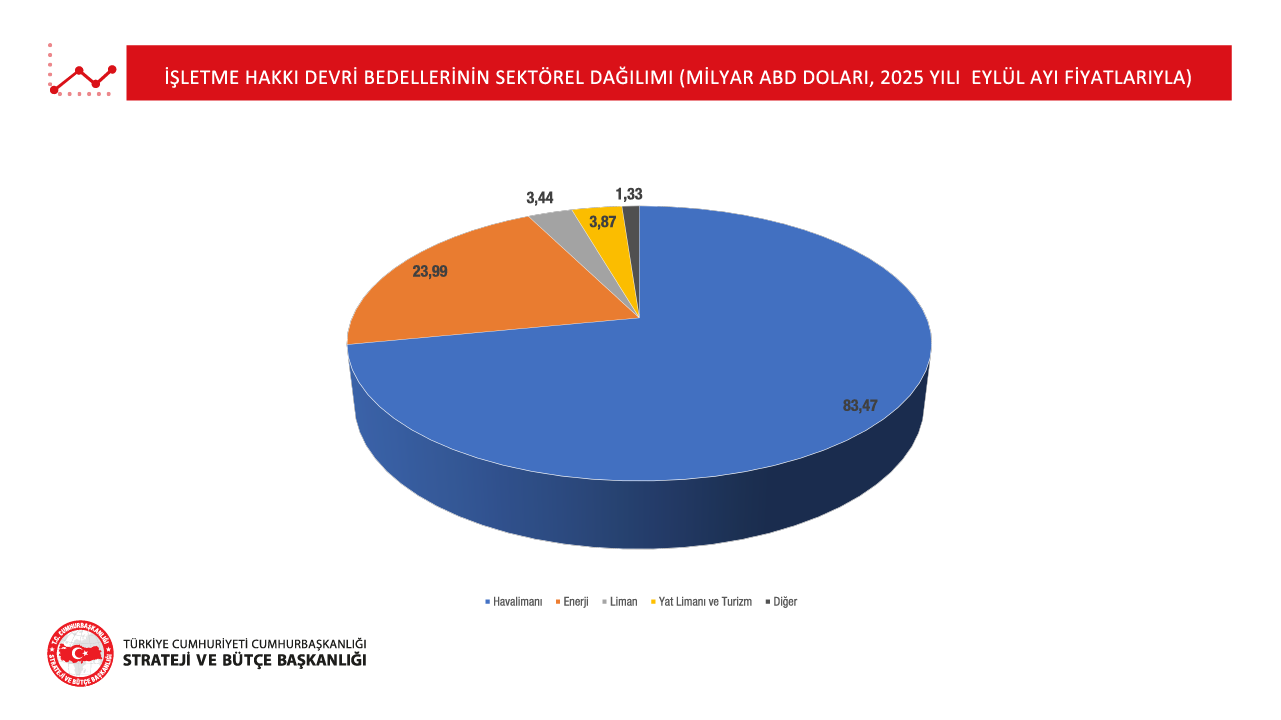 • İşletme hakkı devri bedellerinin[2] sektörel dağılımına bakıldığında havaalanlarının 83,47 Milyar ABD Doları ile (KDV dâhil, 2025 yılı Eylül ayı fiyatlarıyla) birinci sırada bulunduğu görülmektedir. Bunu 23,99 Milyar ABD Doları ile enerji sektörü, 3,87 Milyar ABD Doları ile yat limanları ve 3,44 Milyar ABD Doları ile limanlar ve takip etmektedir.